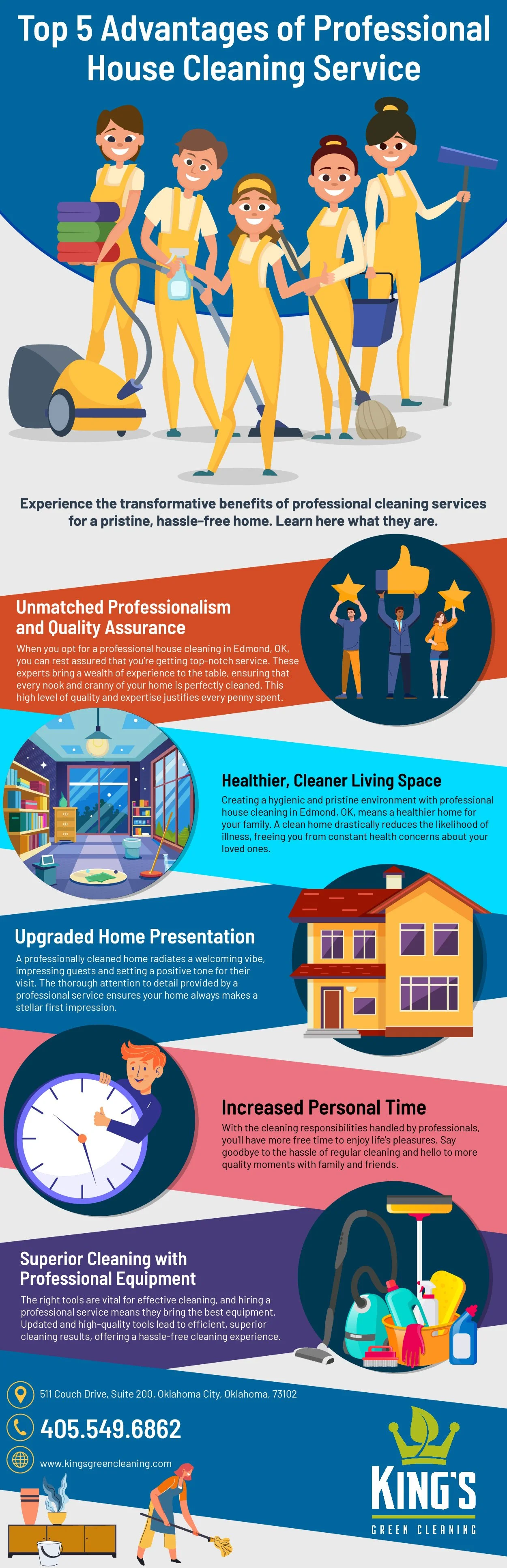 Check out the top five advantages of a professional house cleaning service. With unmatched professionalism and quality assurance, such services guarantee an impeccably clean home, enhancing its ambiance and hygiene. This results in a healthier living space, reducing the risk of illness and providing peace of mind regarding family health. Additionally, the professional touch improves home presentation, impresses visitors, and offers more personal time by handling all cleaning tasks. Finally, using the latest, high-quality equipment ensures efficient and superior cleaning outcomes, making professional house cleaning in Edmond, OK, a wise investment for any homeowner.
